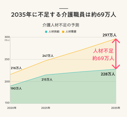 2025年は「団塊の世代」が後期高齢者(75歳以上)に突入する年であり、厚生労働省のデータによれば、40年には介護職員約69万人が不足する見通しだ。