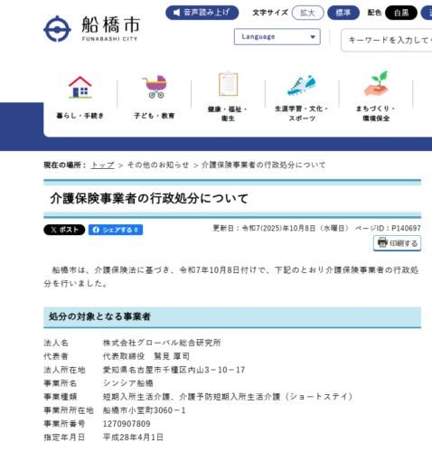 船橋市は10月8日、介護施設「シンシア船橋」に対し、新規受入停止と報酬3割減の処分を出した。
