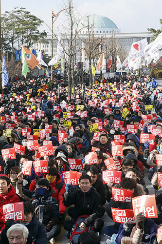 パク政権の労働改悪にノー 韓国・民主労総がゼネスト 韓国で12月16日、パク政権が進める労働改悪に反対して民主労総(組合員80万人)がゼネストを決行。現代自動車、起亜自動車、韓国GMなどの金属労組がストに入り大きな力を示しました。 韓国の国会近く... -