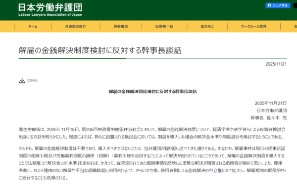 厚生労働省は11月18日、「解雇の金銭解決制度」の導入に向け有識者検討会を設ける方針を打ち出した。労働政策審議会で先送りとなっていた議論が高市政権のもとで再開される。高市首相も提唱する「働きたい改革」=労働時間規制緩和と並ぶ、〝金銭解雇制度〟の動きに強い警戒が必要だ。
